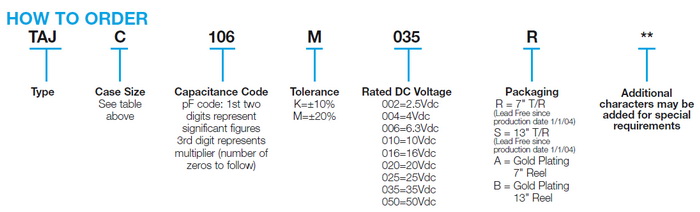 每個(gè)品牌都有自己獨(dú)立的物料編碼系統(tǒng),物料編碼的內(nèi)容可以準(zhǔn)確的體現(xiàn)出產(chǎn)品的信息,想要知道品牌物料的具體參數(shù)就必須了解每個(gè)編碼所表示的意思,現(xiàn)在我們就以AVX鉭電容為例子為大家講解下物料編碼所表達(dá)的含義。我們以AVX鉭電容下面的 TAJB106K020RNJ 型號(hào)為例子: