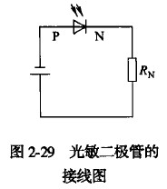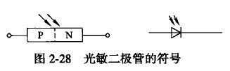 光敏二極管的外形與普通二極管相似。裝在透明的玻璃外殼內(nèi),PN結(jié)殼裝在管子頂部,易于接收光線照射。鍺光敏二極管A、B、C、D四類,硅光敏二極管有2CU1A~D和2DU1~4系列。光敏二極管的符號(hào)如圖2-28所示。光敏二極管的接線如圖2-29所示。