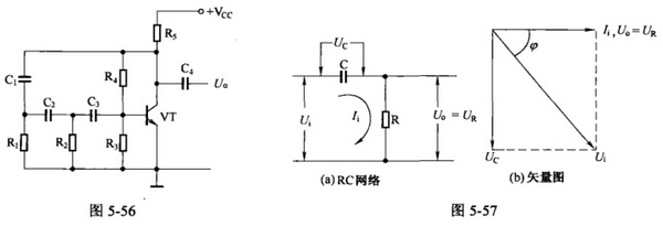b.RC網(wǎng)絡(luò)具有移相作用。RC移相網(wǎng)絡(luò)是利用電容器上電流超前電壓的特性工作的,如圖5-57所示通過電容C的電流I1超前輸入電壓U一個移相角,I1在電阻R上的壓降Ur即為輸出電壓Uo超前輸入電壓U一個相移角(在0度~90度之間)。由組成移相網(wǎng)絡(luò)R和C的比值決定,其矢量圖如圖5-57所示。