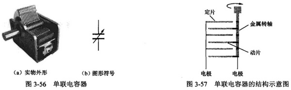 電容器是由多個連接在一起的金屬片作定片,以多個與金屬轉軸連接的金屬片作動片構成。單聯電容器的實物和圖形符號如圖3-56所示。