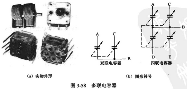 1.外形與圖形符號。多聯電容器是指將兩個或兩個以上的可變電容器結合在一起并且可同時調節電容器。常見的多聯電容器有雙聯電容器和四聯電容器,多聯電容器的實物外形圖形如圖3-58所示。