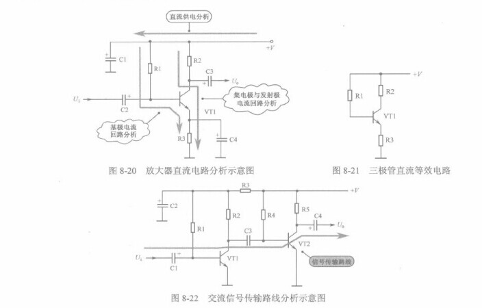 如圖8-20所示是放大器直流電路分析示意圖。對(duì)于一個(gè)單級(jí)放大器而言,其直流電路分析主要是圖8-20中所示的三個(gè)部分。
