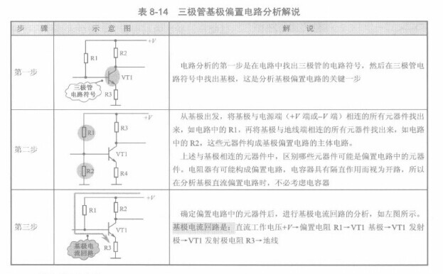 三極管基極偏置電路分析最為困難,掌握一些電路分析方法可以方便基極偏置電路的分析。如表8-14所示是三極管基極偏置電路分析解說。