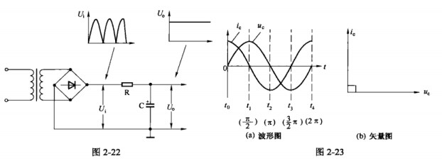 (3)移相。由于通過電容器的電流大小取決于交流電壓的變化率,因此電容器上電流超前電壓90度,具有移相作用,如圖2-23所示。利用電容器上電流超前電壓的特性構成的RC移相網絡如圖2-24所示。圖2-24(a)中,輸出電壓U0取自電阻R,由于電容器C上電流I超前輸入電壓U1,因此U0超前U1一個相移角,