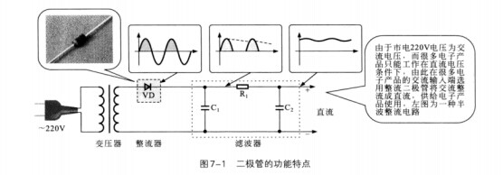 由于二極管具有單向導電特性,在交流電壓處于正半周時,二極管導通;在交流電壓處于負半周時,二極管截止,因而交流電經二極管VD整流后就變為脈動電壓(缺少半個周期)。然后再經RC濾波即可得到直流電壓。