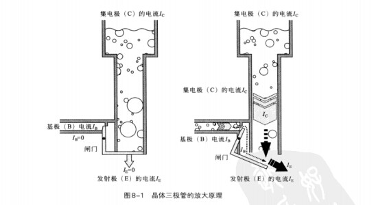 可以看到,水閘側面流過很小的水流流量(相當于電流IB),就可以控制水閘上方(相當于電流IC)流下的大水流流量。這就相當于晶體三極管的放大作用,如果水閘側面沒有水流流過,就相當于基極電流IB被切斷,那么水閘閘門關閉,上方和下方就都沒有水流流過,相當于集電極(C)到發射極(E)的電流也被關斷了。