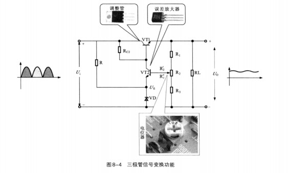 這是一個穩壓電路,電路中的晶體三極管VT1(調整管)起變換作用。三極管VT2(誤差放大管)起穩壓作用。RC2是VT2的集電極負載電阻。穩壓電路輸出電壓的變化量經VT2先放大,然后再送到VT1的基極,這樣只要輸出電壓有一點微小的變化,就能通過VT1的管壓降產生比較大的變化。這樣原本脈動較大的直流電壓就變成了平滑穩定的直流電壓,起到了很好的變換作用。