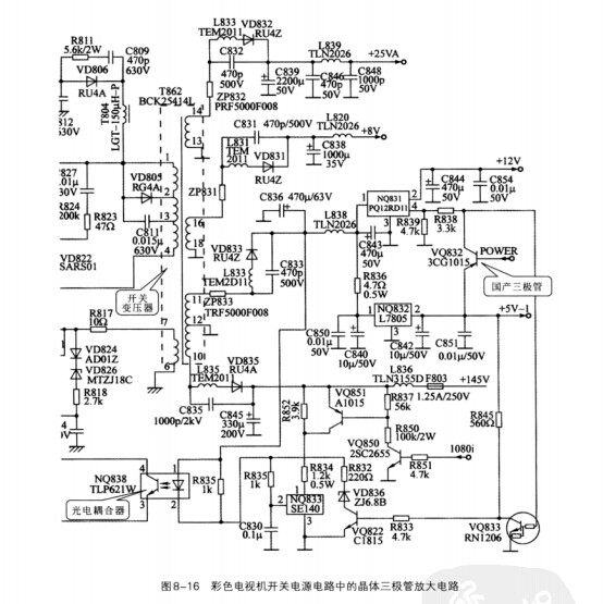 彩色電視機開關電源電路中的晶體三極管放大電路見圖8-16。