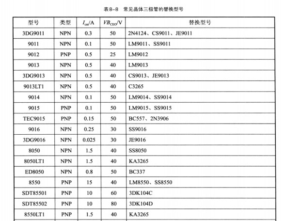 晶體三極管的型號和種類較多,不同種類晶體三極管內部的參數也有所差異,若在代換時,應盡量選用同型號晶體三極管進行代換,有些型號的晶體三極管若代換時無法找到同型號的,也可用其他型號進行代換,常用型號晶體三極管的代換見表8-8所列。