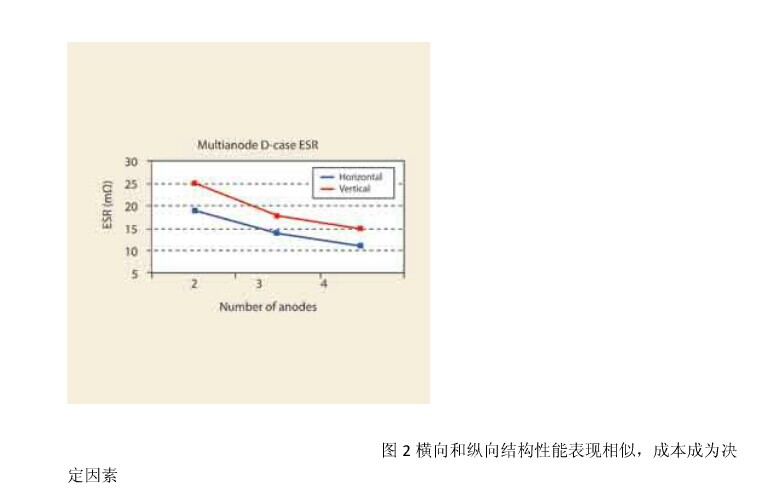 橫向和縱向結(jié)構(gòu)兩者ESR性能之間的差異如圖2所示。這個(gè)例子是基于對(duì)D類電容器的理論計(jì)算,圖2表明,兩陽(yáng)極橫向結(jié)構(gòu)與三陽(yáng)極系統(tǒng)的縱向結(jié)構(gòu)的ESR值相似。然而,相對(duì)而言橫向結(jié)構(gòu)在ESR上性價(jià)比優(yōu)勢(shì)更顯著。