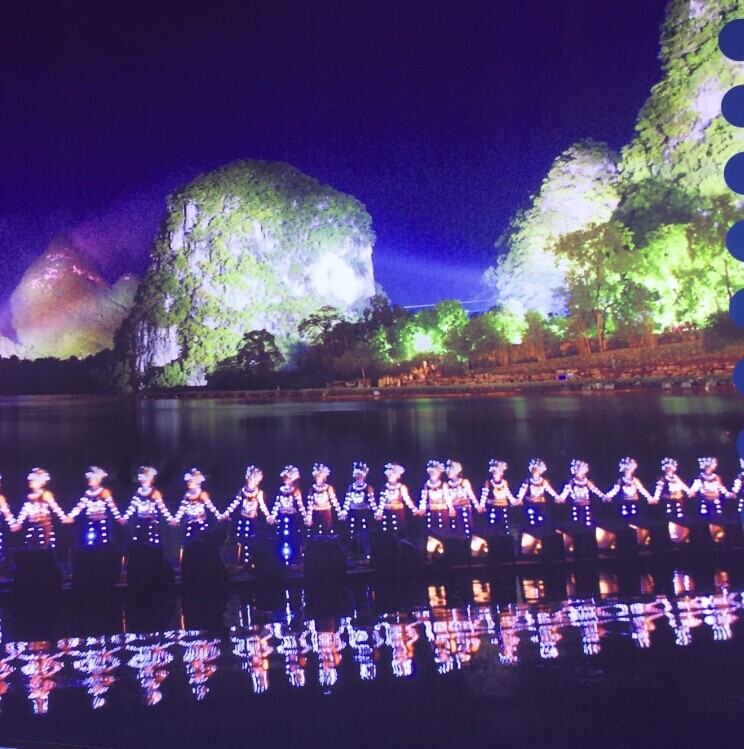 第二日我們便早早驅車,前往陽朔,去到了蝴蝶泉、大榕樹。但凡到了陽朔,自然不會錯過“老謀子”張藝謀導演的大型水上實景演出《印象劉三姐》,印象劉三姐每天晚上都會準時在陽朔之外的漓江上拉開演出的大幕,據說演出場場爆滿,座無虛席。一到演出場外,只見游客們大呼小叫,組織的、入場的、招呼集體的黑壓壓全是人頭,果然座無虛席。那真實的景致、場面的宏大、色彩的艷麗、音響的震撼、美侖美奐,讓所有觀眾為之鼓掌叫好。